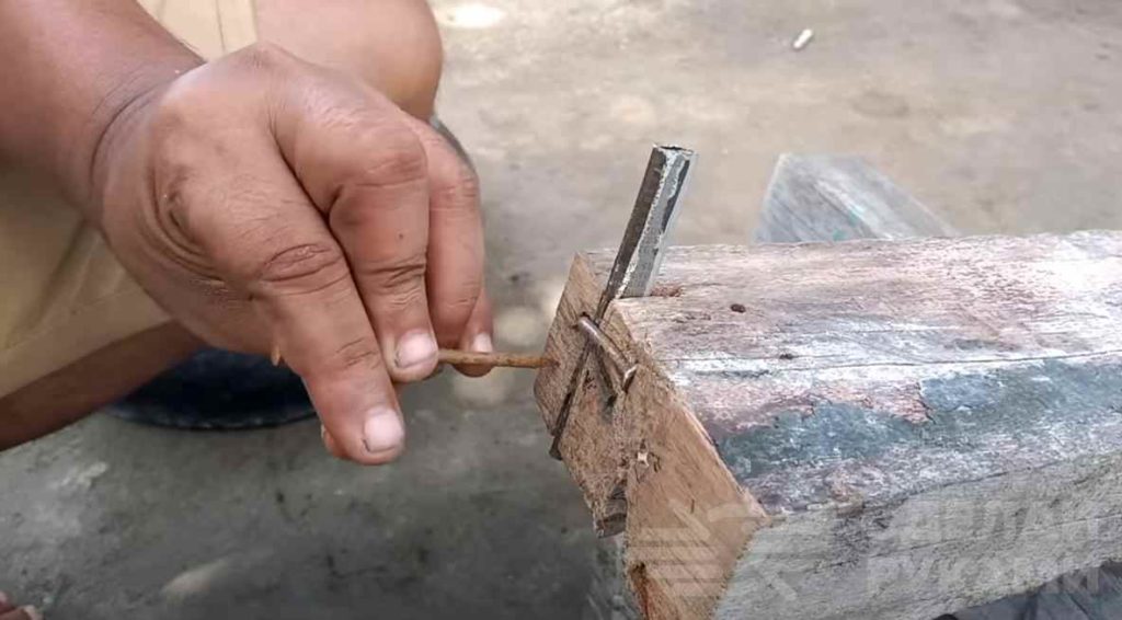 В торце подготовленной доски делаем пропил, и вставляем в него пластину. Фиксируем ее двумя гвоздями, как показано на фото ниже.