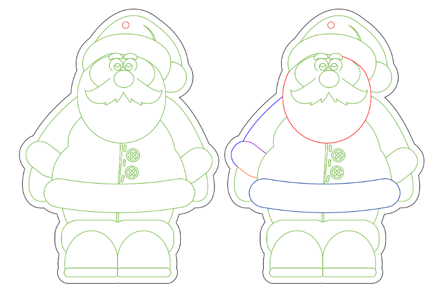 Так выглядит макет, оптимизированный для лазерной резки и псевдо-гравировки. Красный и черный цвет – это резка насквозь, зеленый цвет – прочерчивание (псевдо-гравировка). На картинке справа, для наглядности, разными цветами контуров обозначены линии, из которых состоит Дед Мороз.
