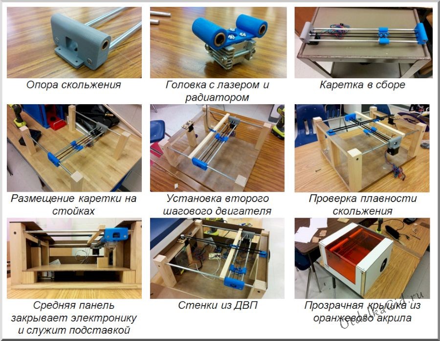 Кроме того, понадобятся подшипники, болты, стяжки, винты и т. д. Станок для лазерной резки является устройством челночного типа. Его подвижные элементы и направляющие служат для перемещения рабочей головки по двум осям, регулируют глубину резки. Шаговые двигатели, двигающие лазерную головку, крепятся на неподвижных частях рамы каркаса и соединяются с подвижными деталями посредством зубчатых ремней.