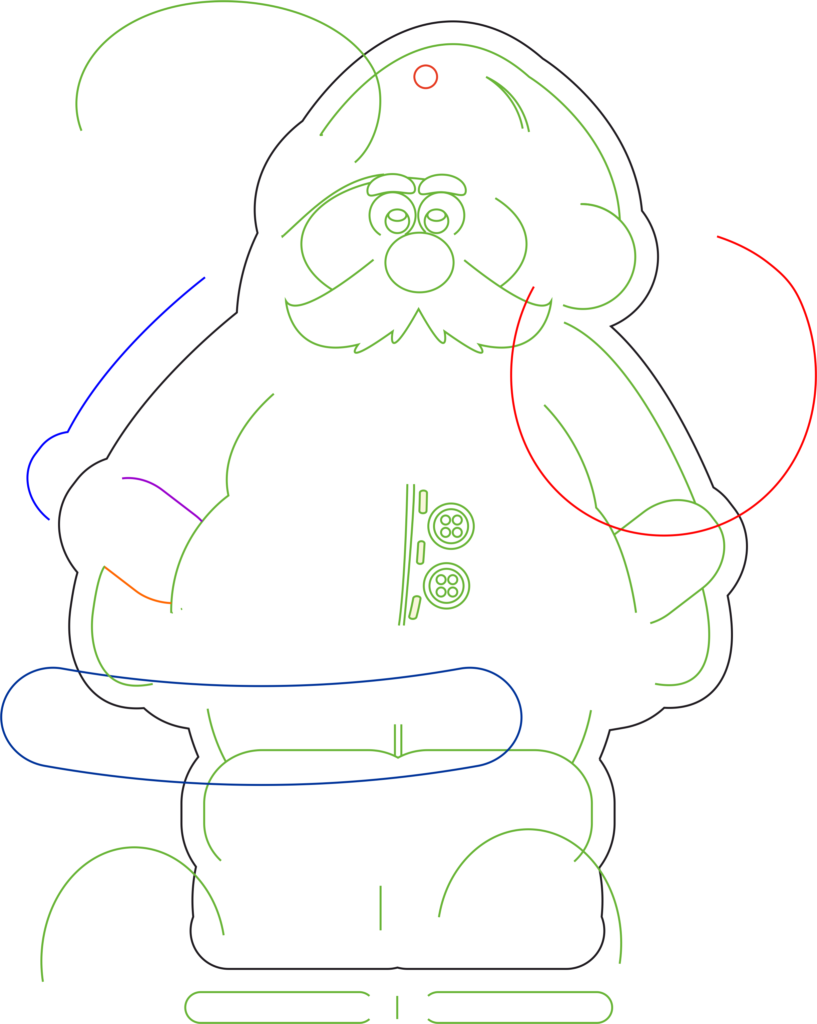 Для качественной и правильной резки заготовок на лазерном станке, векторная графика должна быть оптимизирована, это значит, что у векторов нет наложения линий двух фигур, проходящих по одной траектории, и нет пересекающихся и накладывающихся друг на друга фигур.* псевдо-гравировка – это прочерчивание (в режиме резки) рисунка по контуру на малой мощности лазерного излучателя. Возьмем для примера векторный макет Деда мороза (Санта Клауса).