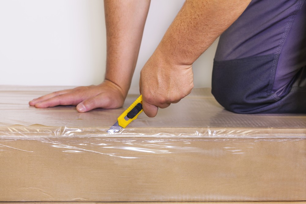 Под полотном перед резкой рекомендуется постелить полиэтиленовый пакет, немного побрызгав водой из пульверизатора. Это приведёт к тому, что частицы гипса при падении набухнут и не разлетятся по комнате. По окончании работ достаточно свернуть плёнку с мусором и выбросить.