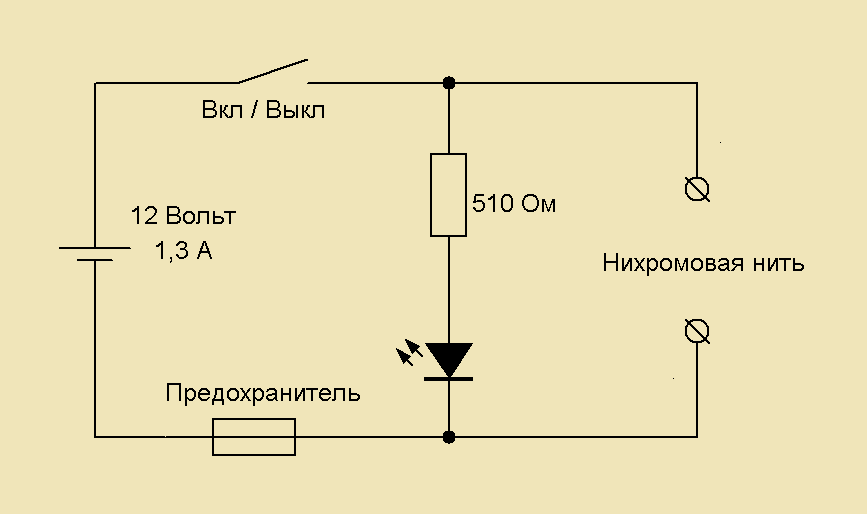 В роли режущего инструменты выступает нихромовая проволока, которая нагревается, при прохождении через неё электрического тока. Блок питания 12 Вольт, 1,3 Ампера я взял готовый, от старого автоответчика. Длина нихромовой проволоки — около 15 сантиметров. Выключатель был уже с встроенной лампочкой, которая светилась при включении, но если у Вас такого нет, на схеме же я показал как подключить обычный светодиод, который показывал бы состояние (включено / выключено).