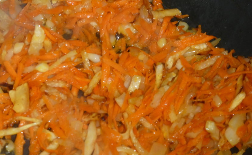 - Морковь очистим и натрем на терке. Отправим пассировать на растительном масле в сковороде до золотистости. При желании можете добавить к моркови измельченную репку лука.