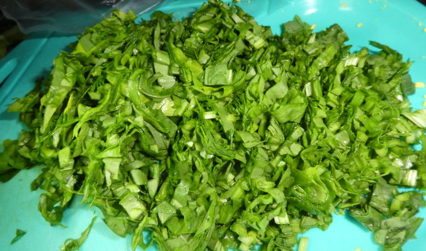 Рубим щавель и другую зелень на желаемые кусочки. Щавеля должно быть больше, чем остальной зелени.