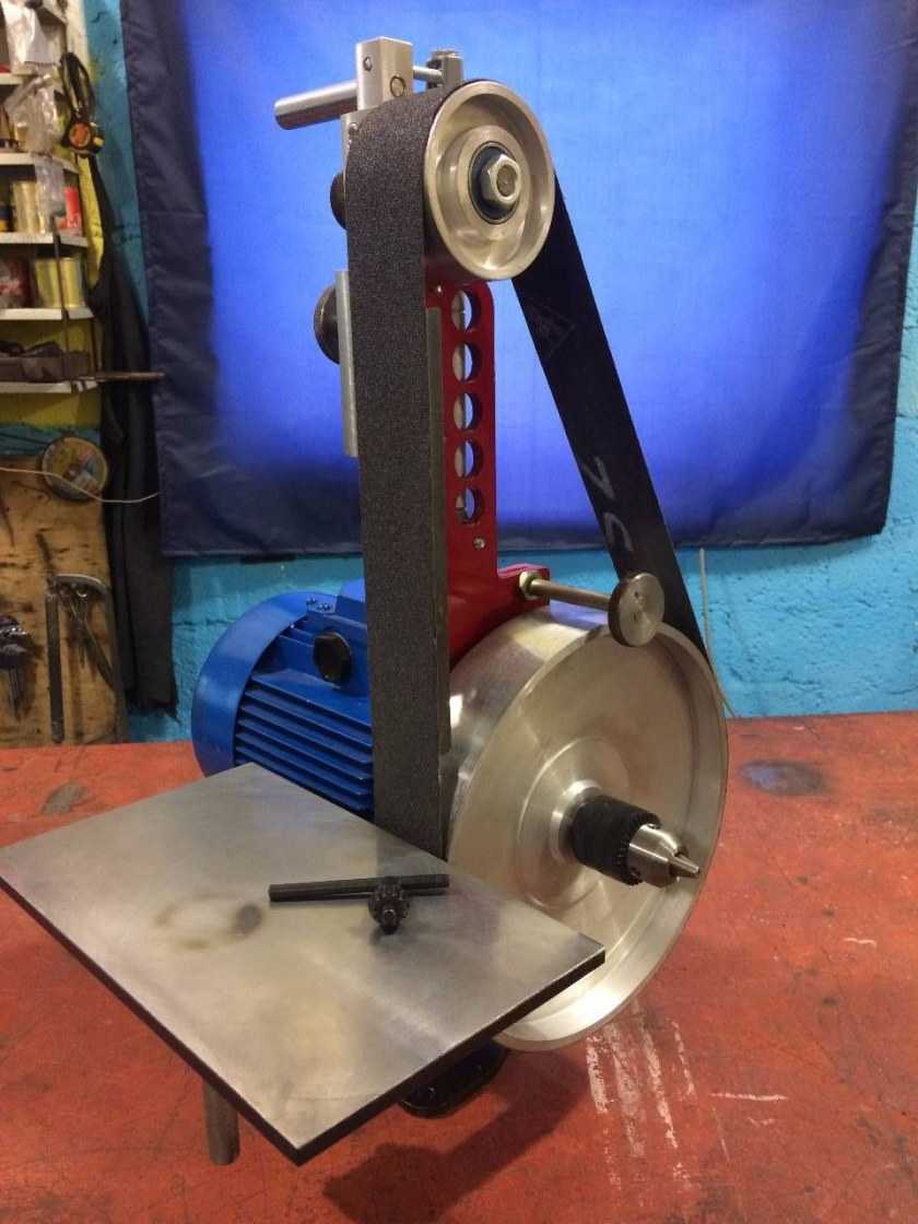 Разница между дисковым и ленточным гриндером не только в возможностях использования. Если взять обычные домашние поделки, то для дискового гриндера хватит мощности привода в 250-300 Вт на валу. Для мелких деревянных деталей – и 150-170 Вт. Это мотор от старой стиральной машины, прямая (обычная) дрель или шуруповерт. А вот для ленточного гриндера понадобится движок от 450-500 Вт: трехфазный с батареями пусковых и рабочих конденсаторов. Если предполагается обрабатывать крупногабарит, то мощность мотора – от 1-1,2 кВт. Причем батареи конденсаторов для того и другого обойдутся ненамного дешевле самого движка.