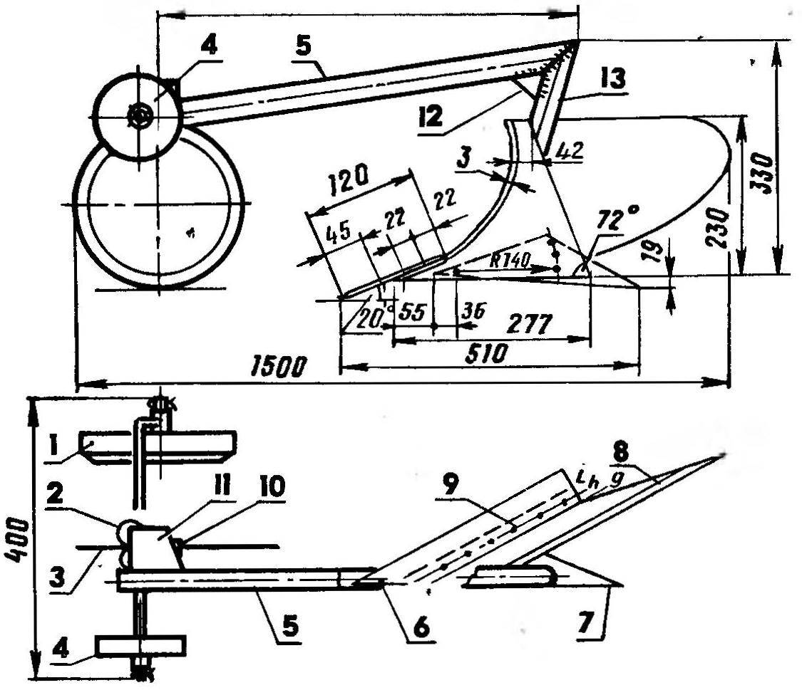 | 2 | Устанавливается боковой щиток, выступающий над лезвием лемеха на 7-9 мм, приваривается к листу и лемеху. |