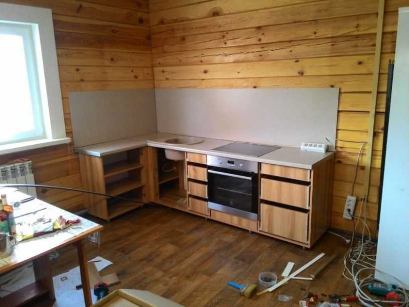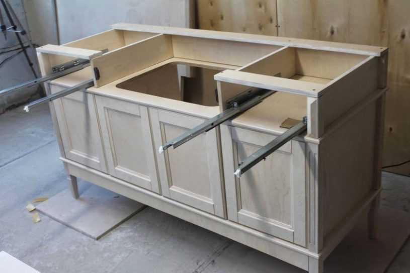 Но есть некоторые конструкции встраиваемой мебели (в частности шкафов-купе), которые требуют подгонки и подпиливания по месту. Некоторые скошенные и радиусные полки также оформляют в процессе установки. Как и врезают варочные поверхности, мойки в столешницы кухни.