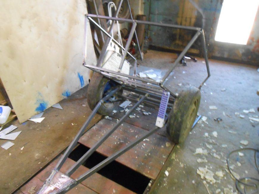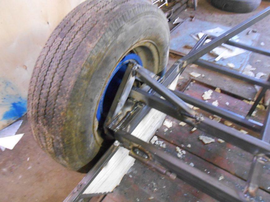 Этот элемент конструкции может быть взят от старого транспортного средства, например, садовой тачки. Для его крепления необходима дополнительная труба. Ступицу можно напрессовать, а ее заднюю часть расточить и укрепить на оси