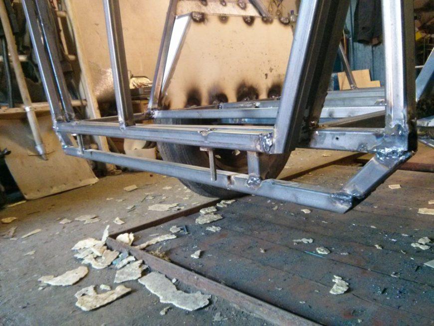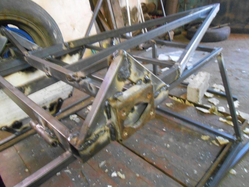 Только после создания рамы и кузова можно переходить к узлу. Для этого потребуются швеллеры или трубы с сечением в виде круга. Стенки трубы должны быть толстыми: только в этом случае конструкция получится прочной и пригодной для перевозки тяжелых грузов. Усилить ее по длине сложно, так как она надежно соединяется с осью посредством балок и угольников.