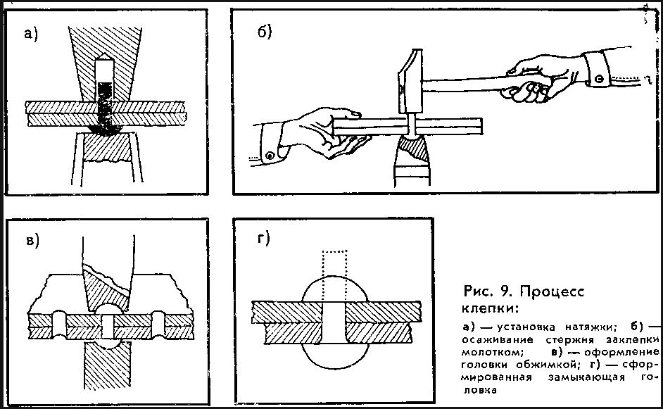 Когда завершена клепка, и головка сердечника прочно засела в втулке расклепанной – стержень отрывается. Склепанные материалы лишь соединены втулкой.