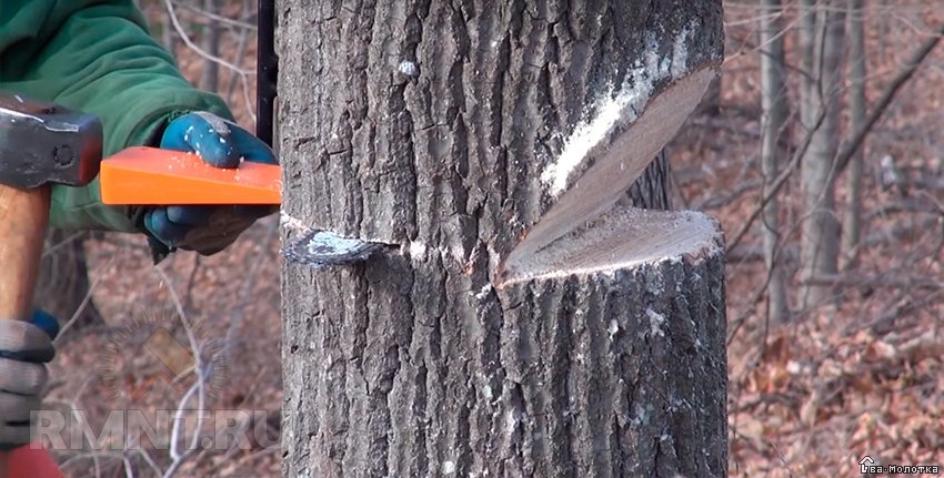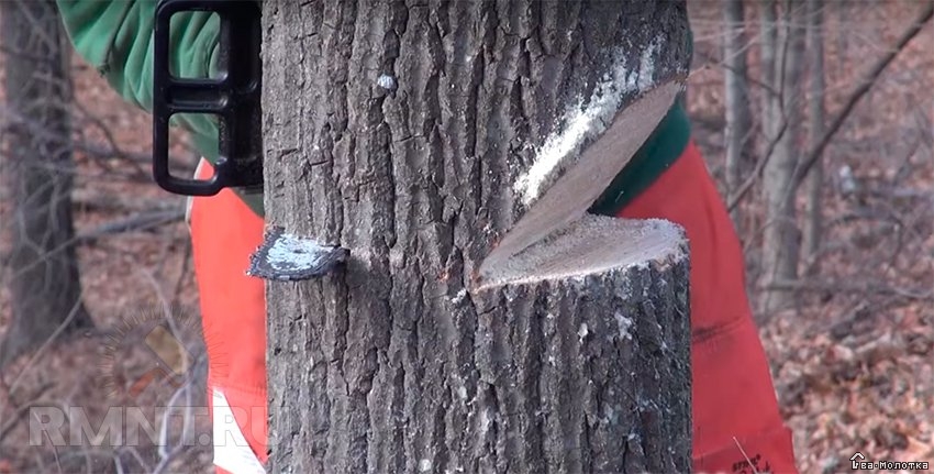- сделать надрез на половину от диаметра бензопилой со стороны наклона или со стороны, в которое распиленное растение должно упасть;