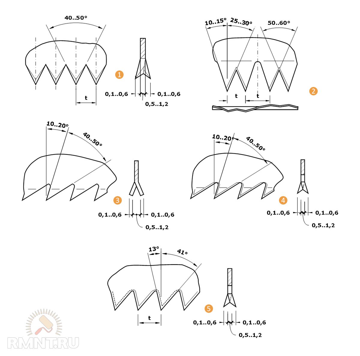 Основные типы зубьев ножовок по дереву. 1 — для поперечной распиловки Тип 1; 2 — для поперечной распиловки Тип 2; 3 — для продольной распиловки Тип 1; 4 — для продольной распиловки Тип 2; 5 — для универсальной распиловки
