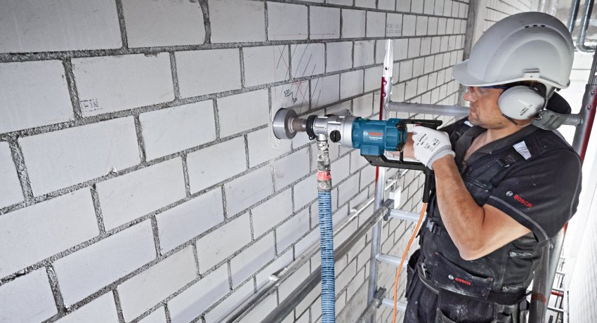 Фотография №5: сверление стены алмазной коронкой с фиксацией бура в горизонтальном положении