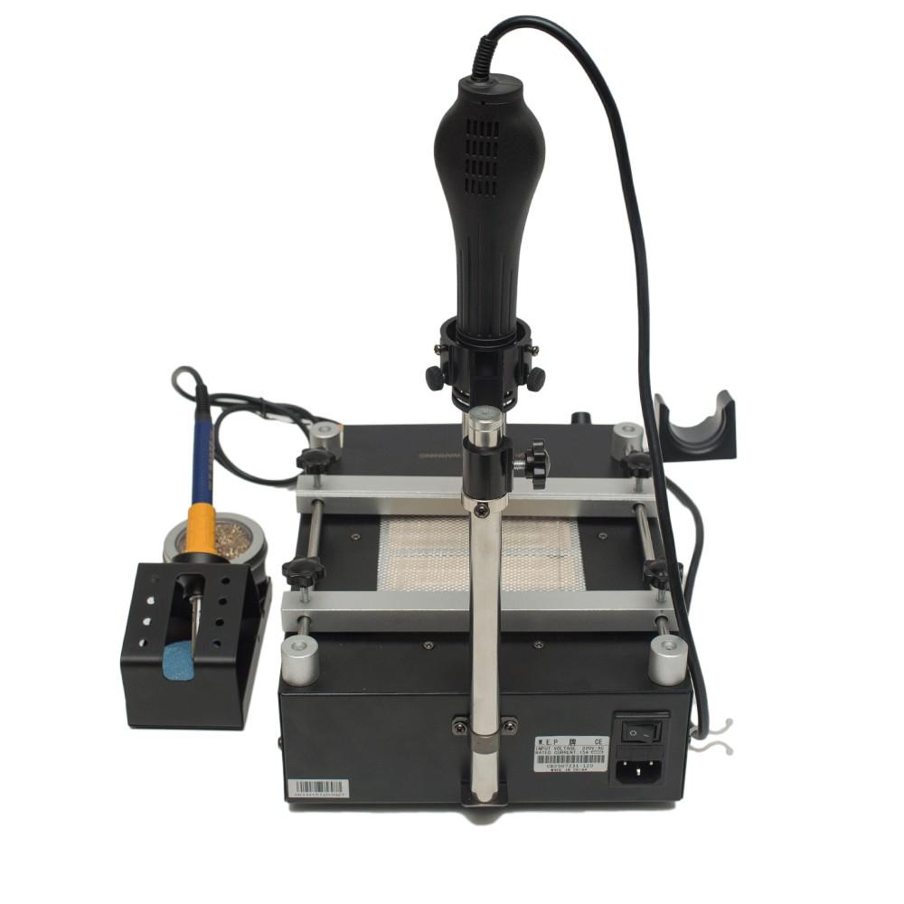 Станция выделяется высокой производительностью и оснащением, поэтому рекомендована экспертами для крупных сервисных центров с большим потоком ремонтируемой техники. Для удержания плат предусмотрена специальная подставка, оснащенная подогревом. Это ускоряет пайку дорожек и микросхем. Еще здесь есть кронштейн для подвешивания паяльника и фена в рабочем положении. Держать детали можно двумя руками, что повышает удобство работы мастеру.