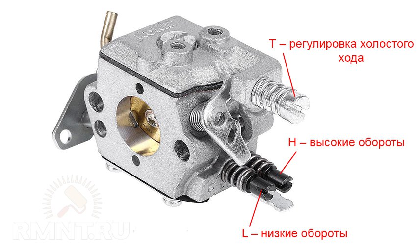 Для этого используются те же винты H, L и T. Стандартом для карбюраторов китайских мотопил является позиция винта L, при которой он ослаблен по сравнению с полностью зажатым состоянием на полтора оборота. Для винта H стандарт – один оборот от такой же позиции. Регулировка холостого хода выполняется на прогретом моторе.