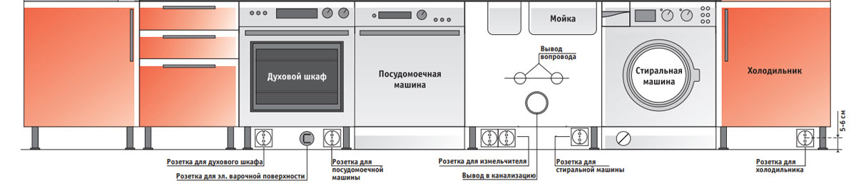 Если на кухне имеется дополнительная техника, встроенная в гарнитур, то для нее делаются отдельные розетки за шкафами. Их рекомендуется монтировать не выше 60 см и следить, чтобы кабель не был пережат мебелью.