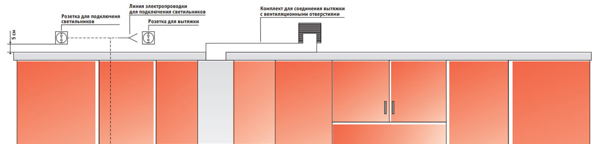 - Розетки под осветительные приборы навесных шкафов удобно размещать на высоте около 5-10 см над мебелью.