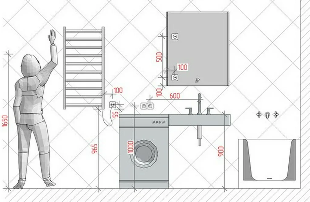Стандартного положения электроприборов для этих помещений нет, здесь в первую очередь учитываются так называемые «зоны влажности», то есть места, где наиболее велик риск намокания расположенных на стене элементов, в том числе электроприборов.