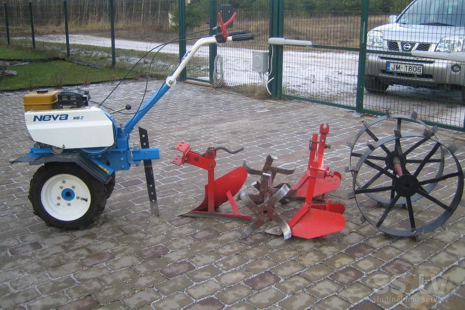 Плуг для мотоблока Нева обладает стандартной конструкцией и благодаря универсальным креплениям может агрегатироваться с большинством моделей популярных среди дачников мотокультиваторов. Фактически это прицепная тележка к мотоблоку, рабочая поверхность которой оснащена погружными зубьями и регулировочным рычагом, определяющим глубину обработки почвы. Для обработки легкой почвы в качестве альтернативы плужку используются также снегоуборщики для мотоблока Нева МБ2.