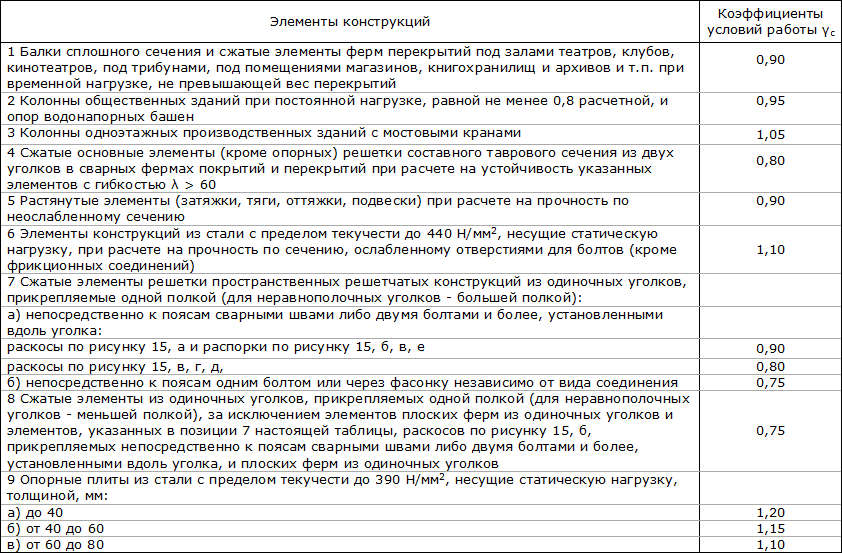 γс — коэффициент условий работы элементов конструкций и соединений, принимаемый по следующей таблице: