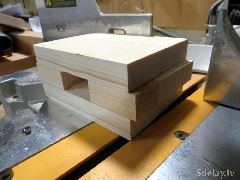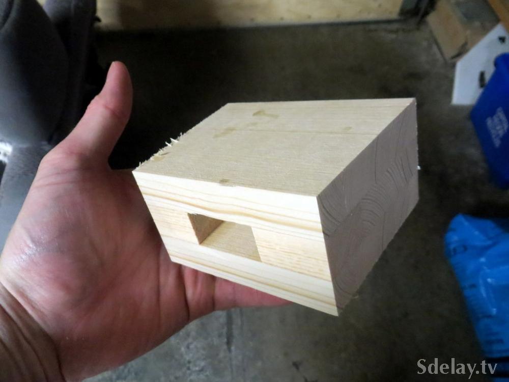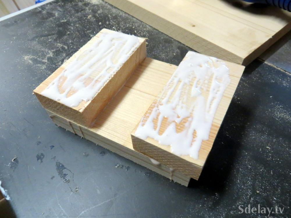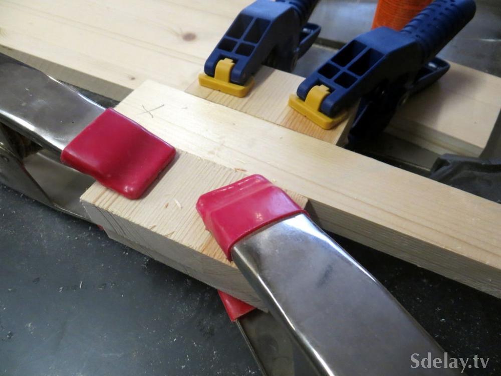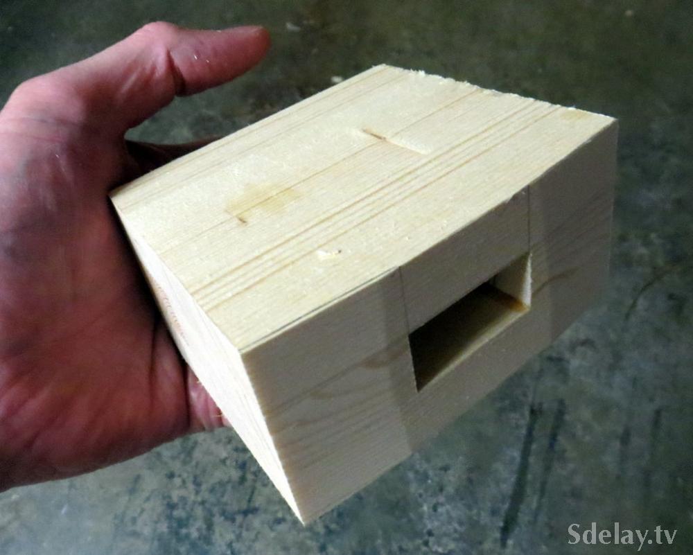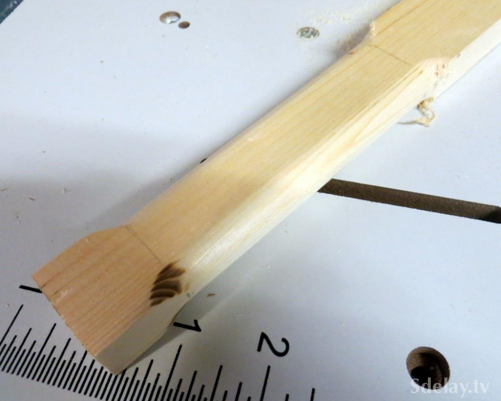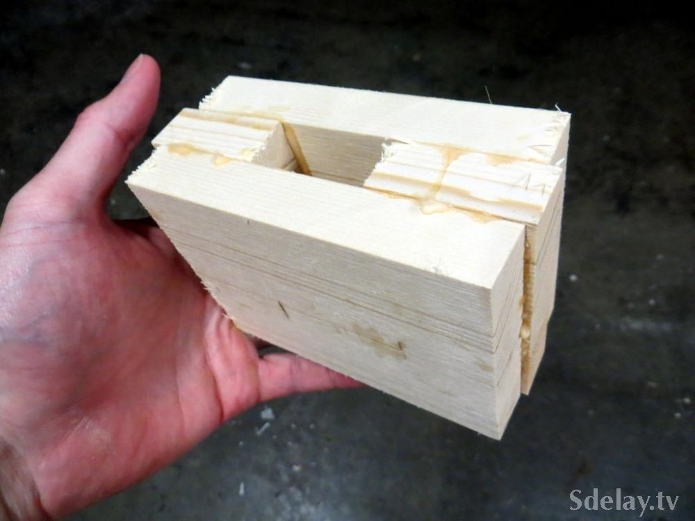 4. Собираем части бойка, оставив паз для дальнейшего крепления рукоятки. Наносим клей, зажимаем струбциной или тисками и ждем полного высыхания (как минимум 2 часа).5. Пока боек склеивается, можно придать форму ручке, сгладив углы в месте хвата. Для этого наиболее удобно пользоваться фрезой. Если же в Вашем арсенале такой инструмент отсутствует, можно обтесать грани топором или стамеской, после чего зачистить наждачной бумагой.6. Когда боек окончательно высохнет, его боковые (ударные) части рекомендуется слегка подпилить под небольшим углом. Чтобы не ошибиться в наклоне, просто отмечаем по 10 мм от нижних частей бойка и чертим к ним линию от верхних углов. Суть в том, чтобы боек получился не прямоугольный, а призматический, как на фото ниже.