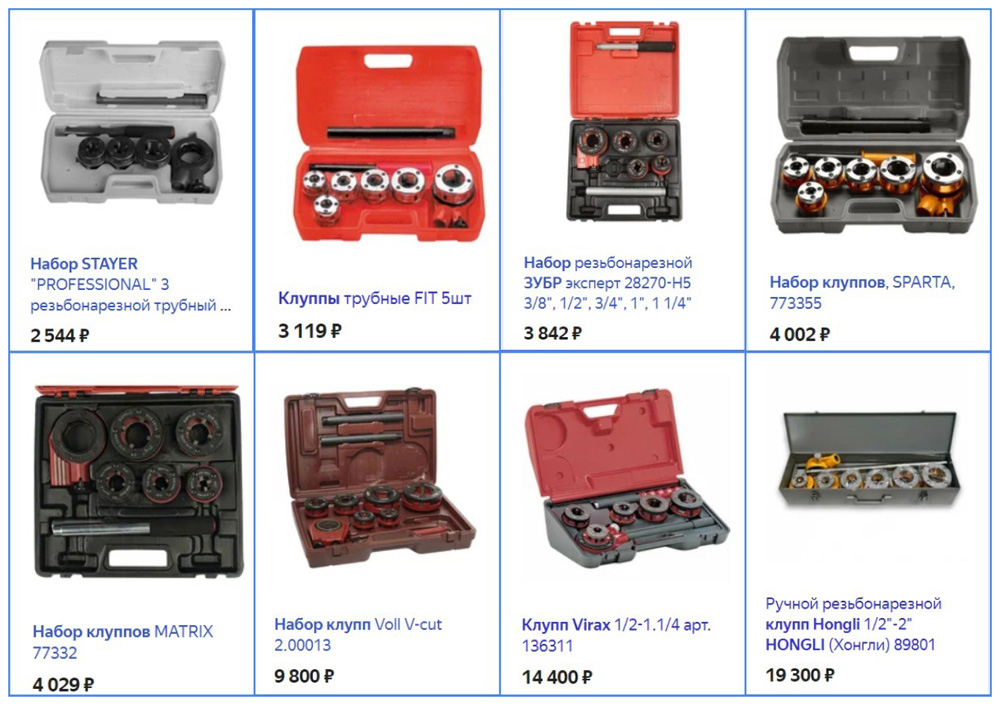 Обычно инструмент для нарезания резьбы на трубах реализуется в наборах, элементы которого помещены чемодан для транспортировки, стандартная комплектация – несколько насадок и трещотка со съемными ручками, баллон фирменного масла. Наиболее часто в продаже можно встретить комплекты и отдельные клуппы следующих марок: