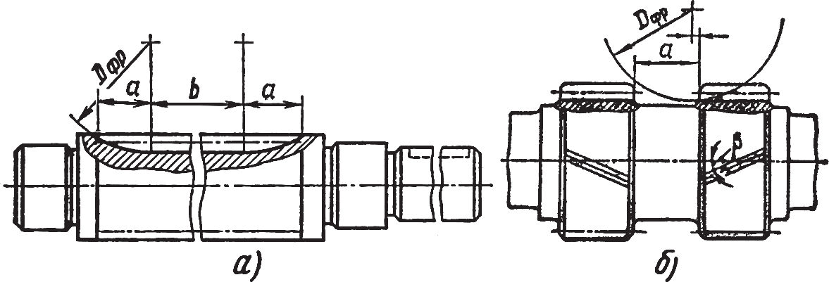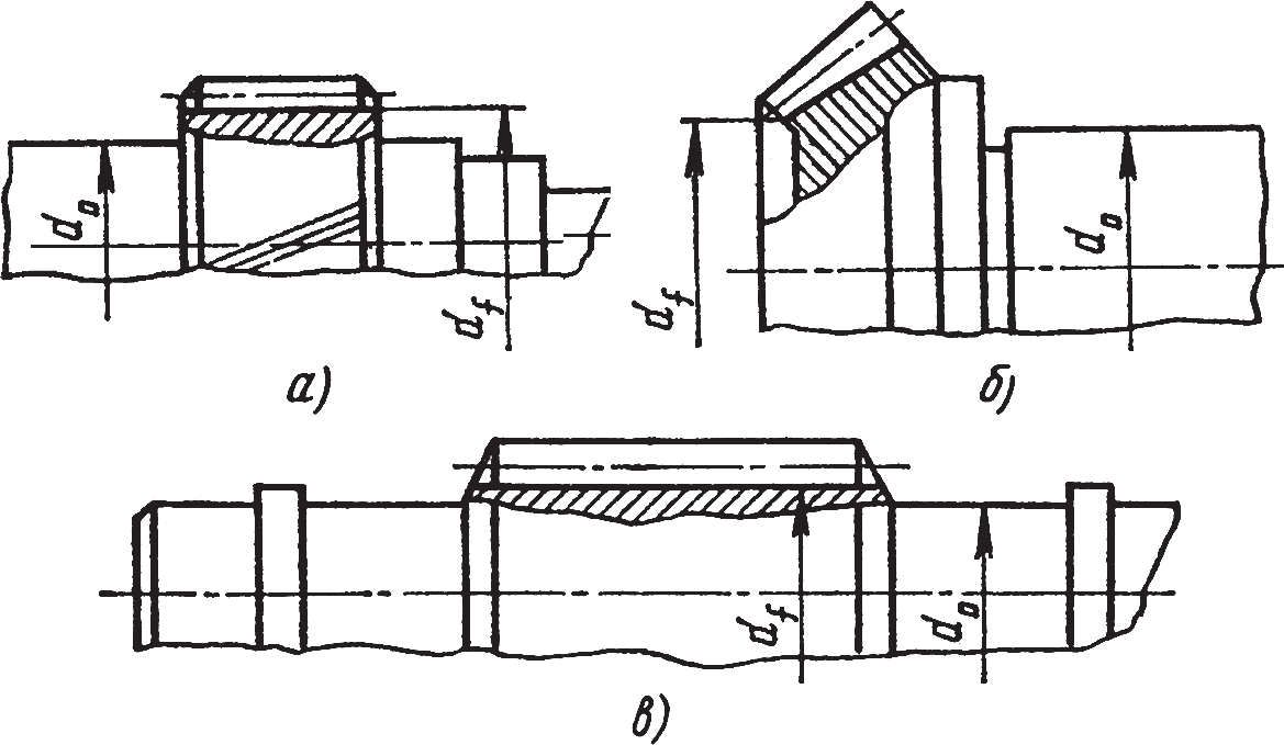 В некоторых случаях зубчатый венец углубляется в тело вала. При углублении зуба в тело вала следует учитывать участки входа и выхода фрезы (табл. 1). Возможность выхода фрезы следует учитывать также при нарезании рядом расположенных венцов на вале-шестерне (рис. 1; а, б).