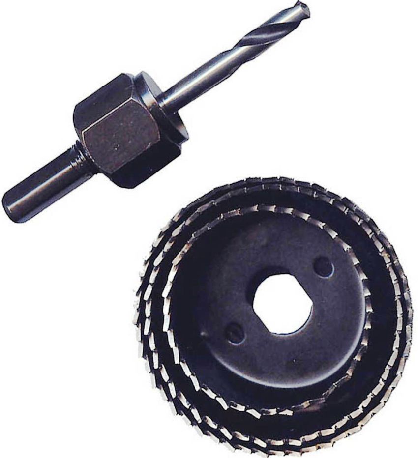 - Сам патрон, конструкция не сложная, по центру в него вставляется сверло и зажимается фиксирующим болтом, при помощи идущего в комплекте шестигранника. Режущая чашка вставляется с обратной стороны и также фиксируется прижимной гайкой.
