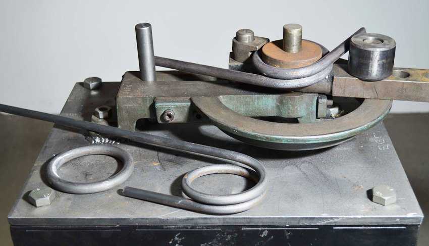 Шаблон представляет собой окружность со втулкой для рычага в центре. Прут или труба одним концом фиксируются на краю дуги. Рычаг перемещается вдоль дуги и роликом прижимает заготовку к шаблону.