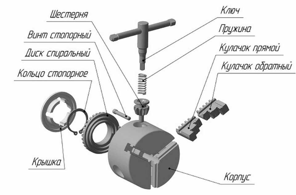 Патрон представляет массивную планшайбу, в которой прорезаны радиальные пазы. В них перемещаются три кулачка, приводимые в действие конической зубчатой передачей, которая смонтирована внутри планшайбы. Одно из колец снабжено торцевой резьбой, называемой спиралью Архимеда, при помощи которой его можно вращать ключом. При вращении этой спирали происходит одновременное перемещение всех кулачков.