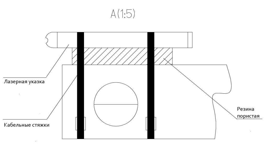 Далее указка устанавливается на пузырьковый уровень. А для того чтобы качественно закрепить излучатель на корпусе строительного уровня, вполне достаточно использовать кабельные (многоразовые) стяжки, а для возможности корректировки, между строительным уровнем и лазерной указкой следует проложить пористый материал (например, резину) как это показано на рисунке.