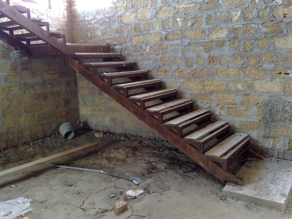 Изготовив кобылки, можно приступить к сварке лестницы. Крепление тетив осуществляется на опорную стойку из металла (внизу), вмонтированную в бетон. Металлические лестницы, если одна тетива пристенная, можно приваривать к стенным кронштейнам, это придает конструкции жесткость.