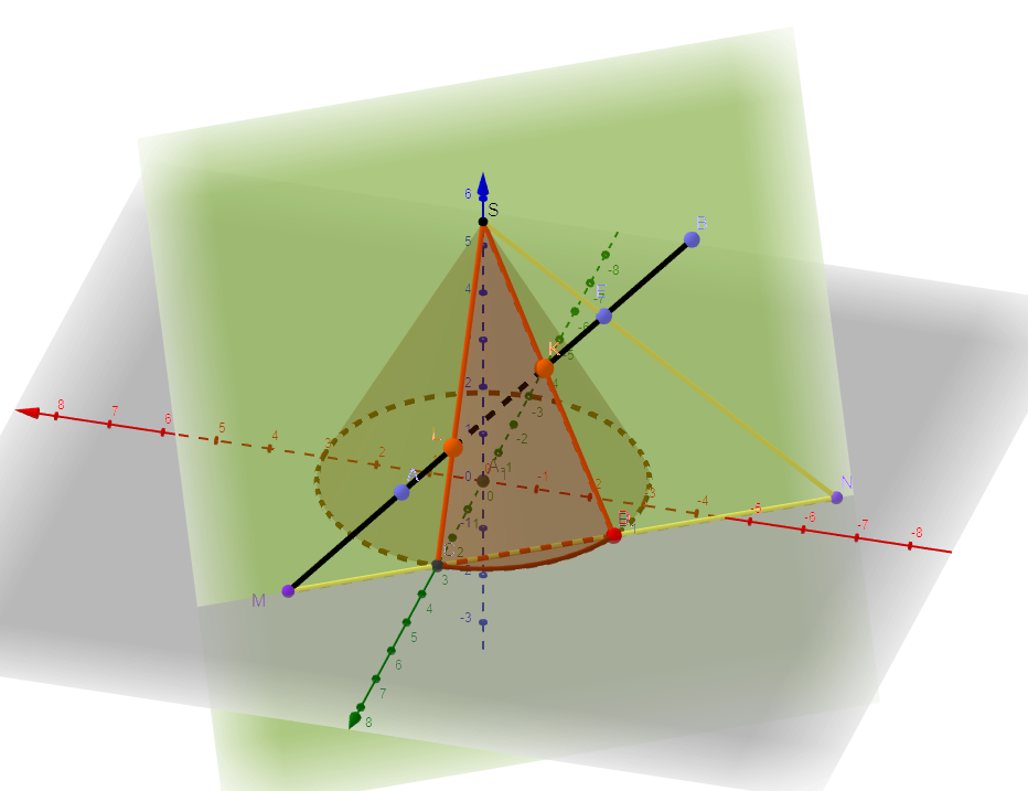 - На пересечении образующих 1-S и 2-S с прямой m получим искомые точки K и L.