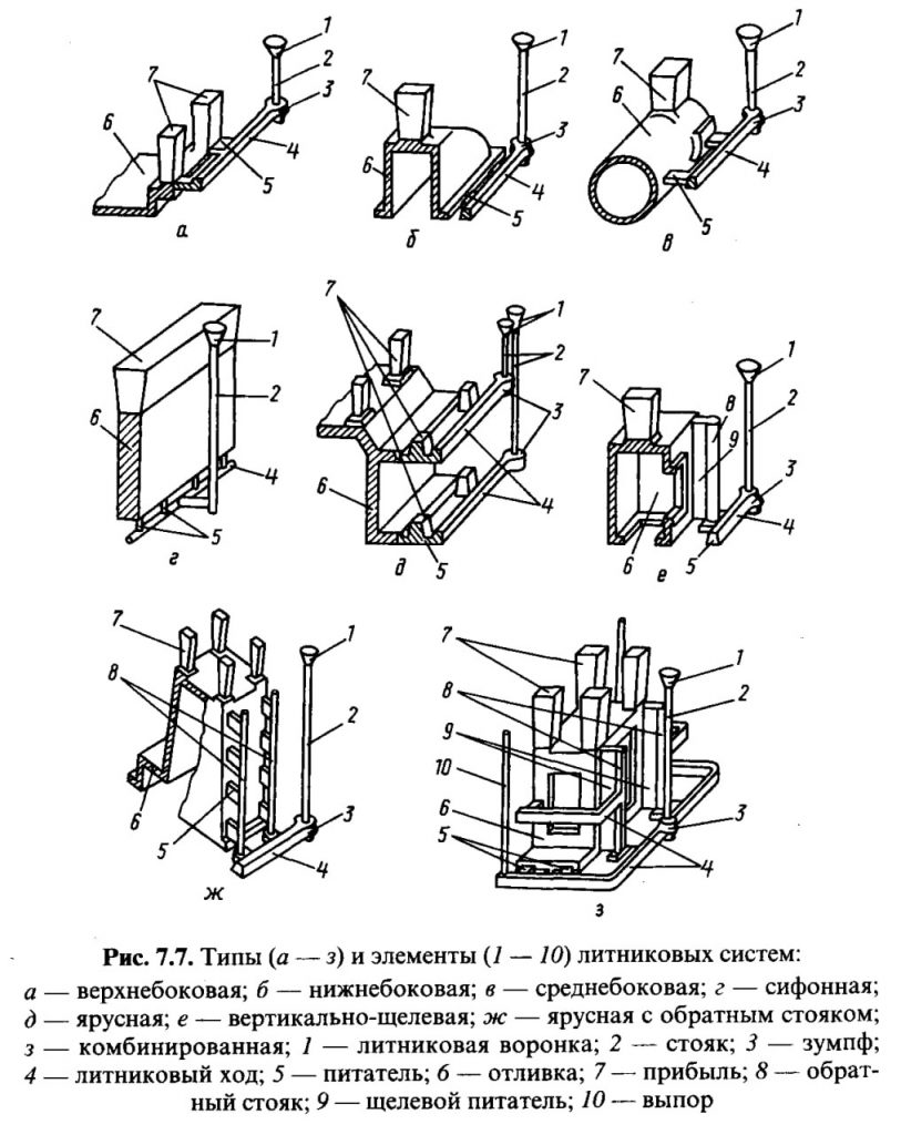 Сифонная заливка металла через ступенчатую литниковую систему (рис. 3.12, ж) обеспечивает благоприятное распределение температуры в отливке.