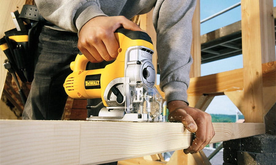 -Подсветка в вопросе, какой электролобзик выбрать, важна при работе в затемненных помещениях, на плохоосвещенных площадях. Можно взять, к примеру, Dewalt «349». У него и светодиоды есть, и платформа регулируется, и опилки сдуваются, есть накладка для защиты распиливаемого материала.