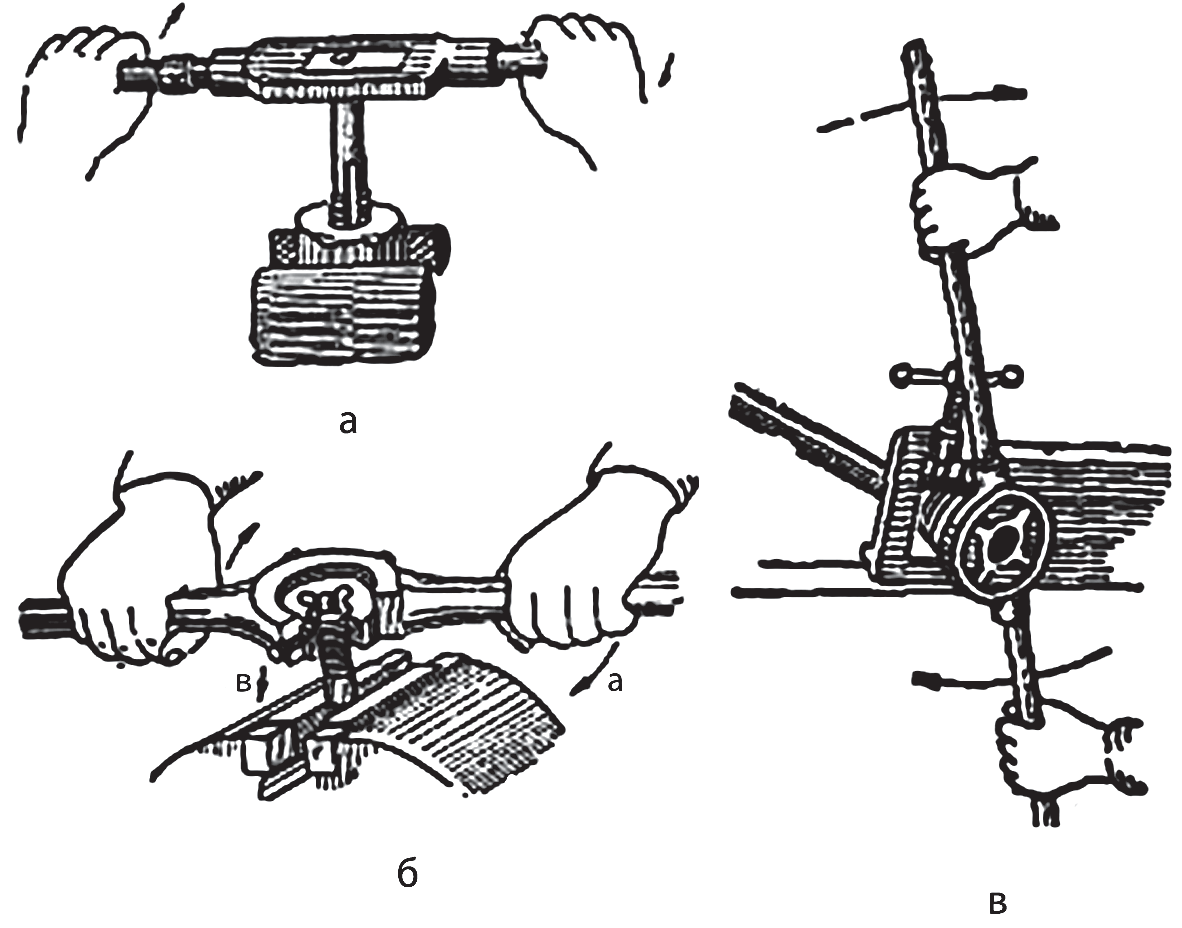 Таким же образом следует вести нарезание резьбы плашками. Здесь, однако, кроме круговых движений по стрелке а (рис. 10, б), воротку следует сообщать также некоторый нажим вниз по стрелке в. В процессе нарезания необходимо следить, чтобы давление на обе ручки было одинаковым.