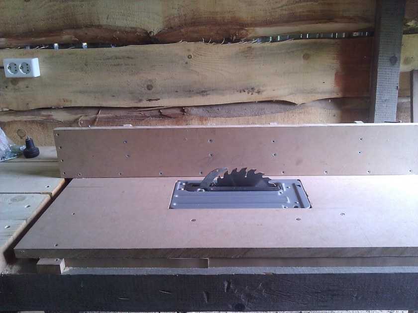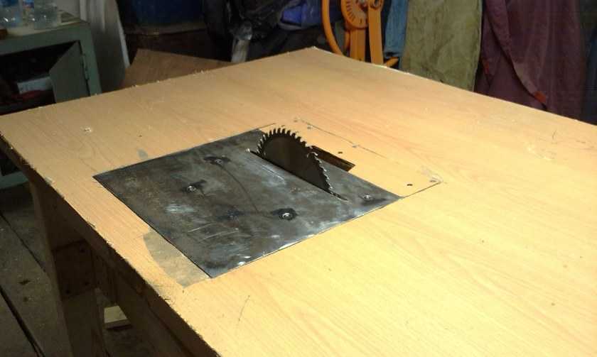 Посредине столешницы делают прямоугольное окно, которые затем закрывается вставкой из дюралюминия или оргстекла с прорезью для диска. Такая вставка позволяет обеспечить плавное перемещение обрабатываемой доски или листа вдоль линейки.