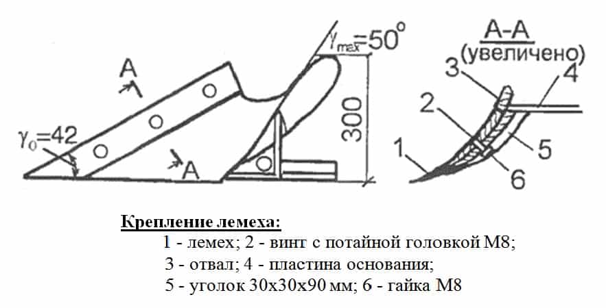 Лучшим вариантом конструкции будет плуг со съемным лемехом, который всегда можно заточить без сложностей. Также возможен вариант изготовления плуга с использованием сварки: отвал приваривается к лемеху и щитку сзади. Такая конструкция обладает большей прочностью, но возникают трудности с заточкой режущей части.