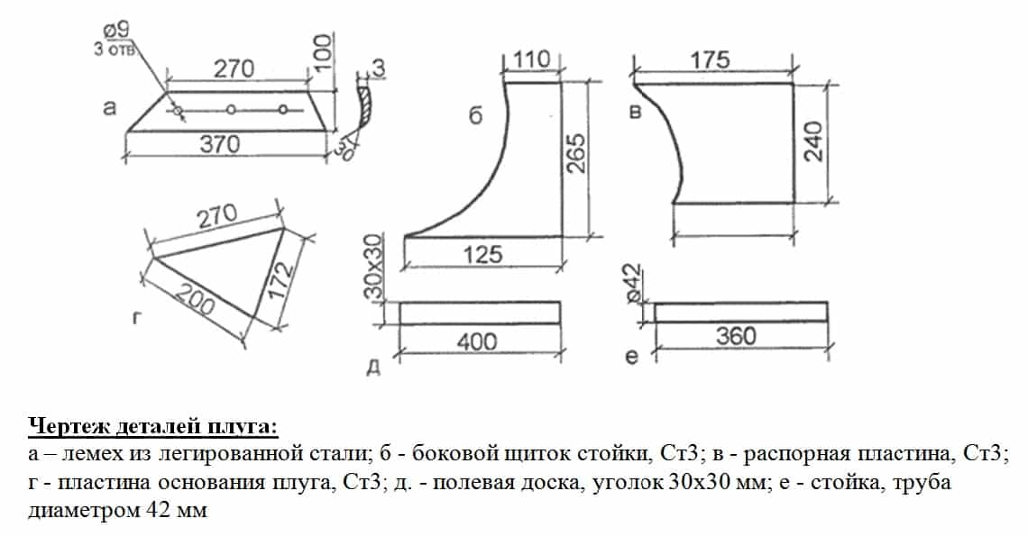 После этого детали собираются. Для начала вы можете все это сделать с помощью картонных заготовок. И если все параметры будут соблюдены, а сам плуг получился правильный и надежным, тогда можете приступать к металлическим деталям.