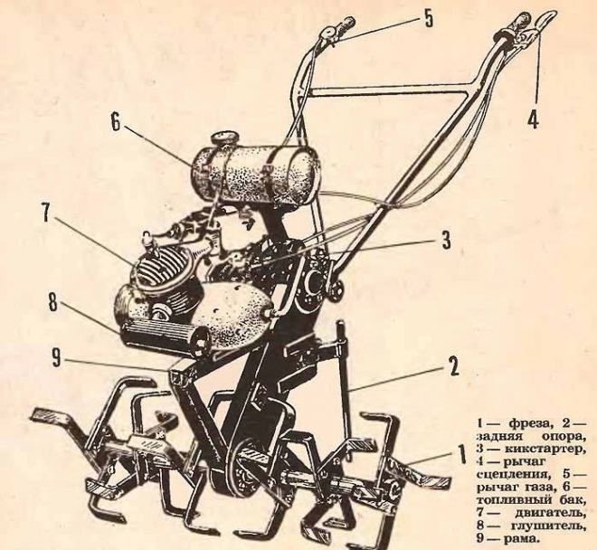 - от бензопилы «Дружба» — двигатель, топливный бак, редуктор;