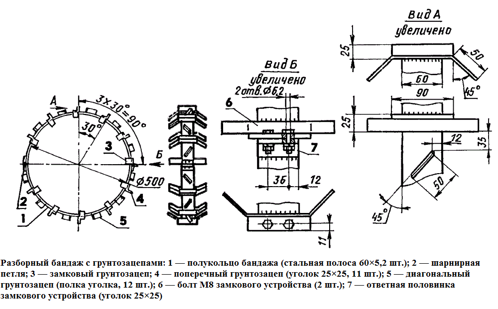 - сборка грунтозацепов на базе автопокрышек, лишенных резины (чертеж ниже). Для лучшей сцепки с почвой их дооснащают металлическим уголком.