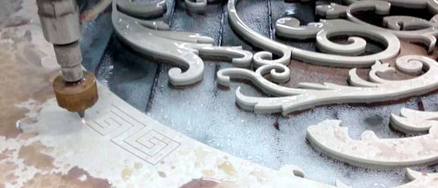 Фигурная резка необходима при создании орнаментов, а также в тех случаях, когда поверхность имеет сложные изгибы. Выполнить в домашних условиях такую работу не получится. Для этого типа обработки требуется дорогостоящее профессиональное оборудование − гидроабразивный станок.