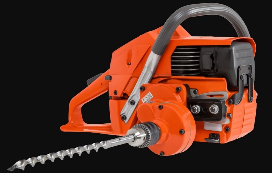 - Мотобур — агрегат для бурения отверстий в грунте с последующей установкой в них столбиков