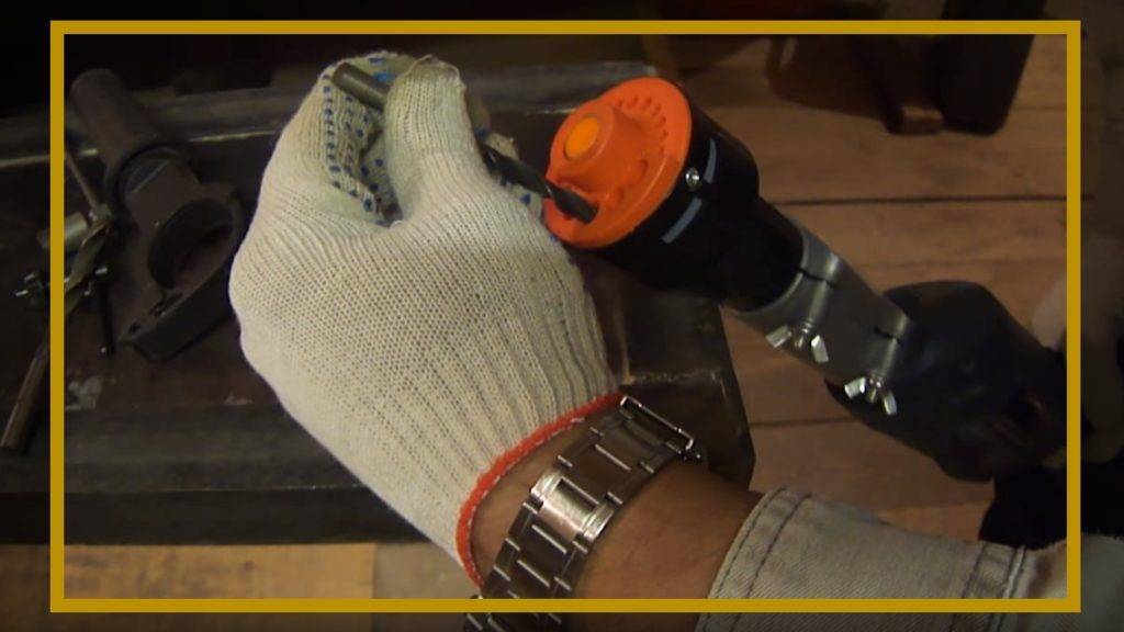- Дрель запускают и вставляют инструмент в отверстие корпуса насадки с соответствующим диаметром.