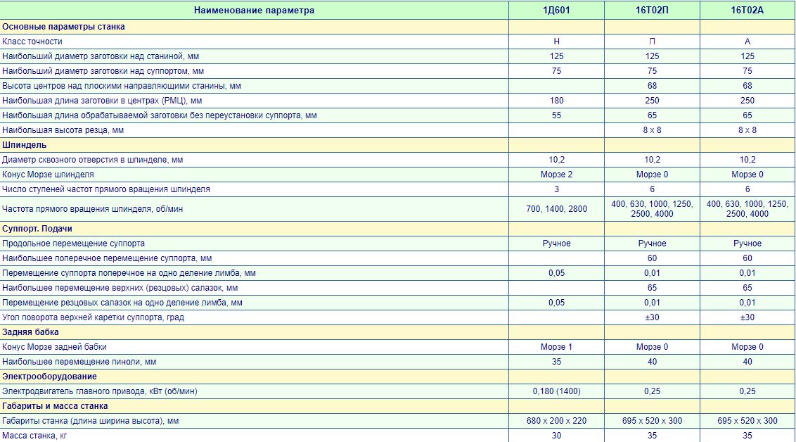 На конце шпинделя консольно установлен трехступенчатый шкив, передающий вращение от электрического двигателя. Происходит это посредством синтетического плоского ремня. Передний конус изготовлен конусом Морзе КМ 2, задний корпус же, предназначенный для оправки устройства заточки, установлен под углом 40 градусов. Посадочный диаметр – 10 А. С помощью 1д601 можно обрабатывать тончайшие прутики, диаметр которых не достигает 10 мм.