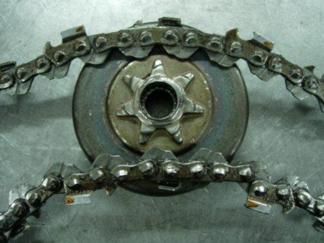 Такое случается, когда изнашивается ведущая или ведомая звездочка. Цепь обычно начинает клинить под нагрузкой. Но без нагрузки пила может вращаться. На фото ниже показана изношенная ведущая звездочка бензопилы.