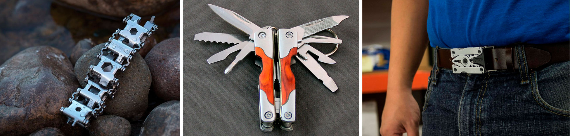 Мультитул-браслет, который будет не «всегда под рукой», а буквально, всегда на руке. В состав украшения-инструмента входят отвертки, биты, стеклобой, гнезда для гаек, открывалка. Существует еще одна версия такого браслета, которая дополнена часами.