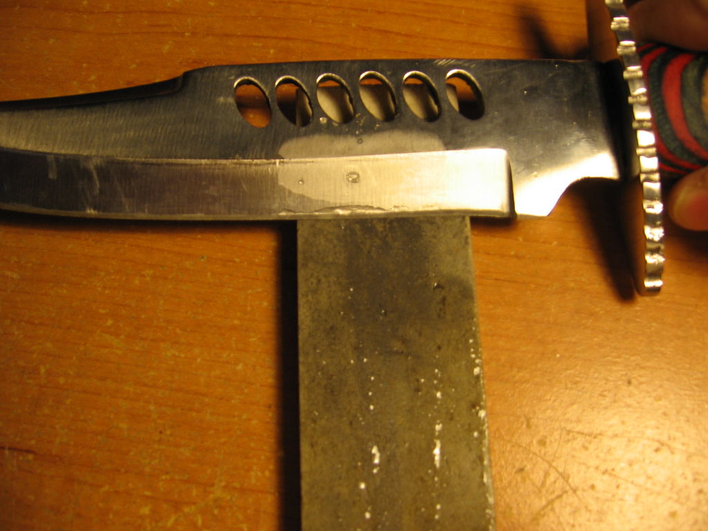 - Чтобы присоединить лезвие к рукояти, нужно по центру тупой части лезвия сделать отверстие с учетом диаметра крепежа, которое в дальнейшим будет использовано по назначению.