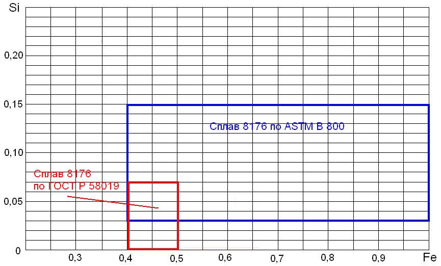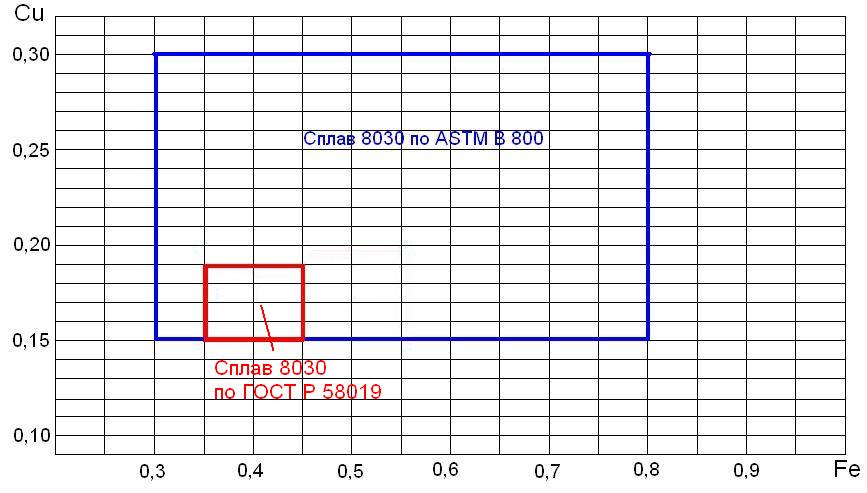 Отметим, что российские сплавы 8030 и 8176 существенно отличаются от своих американских и европейских аналогов (см. таблицы 4-6). На рисунках 7 и 8 показаны пределы содержания основных легирующих элементов в сплаве 8030 (железо-медь) и 8176 (железо-кремний) по ASTM B 800 и по ГОСТ Р 58019. Российские сплавы имеют значительно более низкое содержание легирующих элементов – железа, меди и кремния.