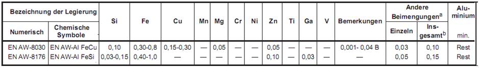 Таблица 5 – Сплавы 8030 и 8176 в EN 573-3